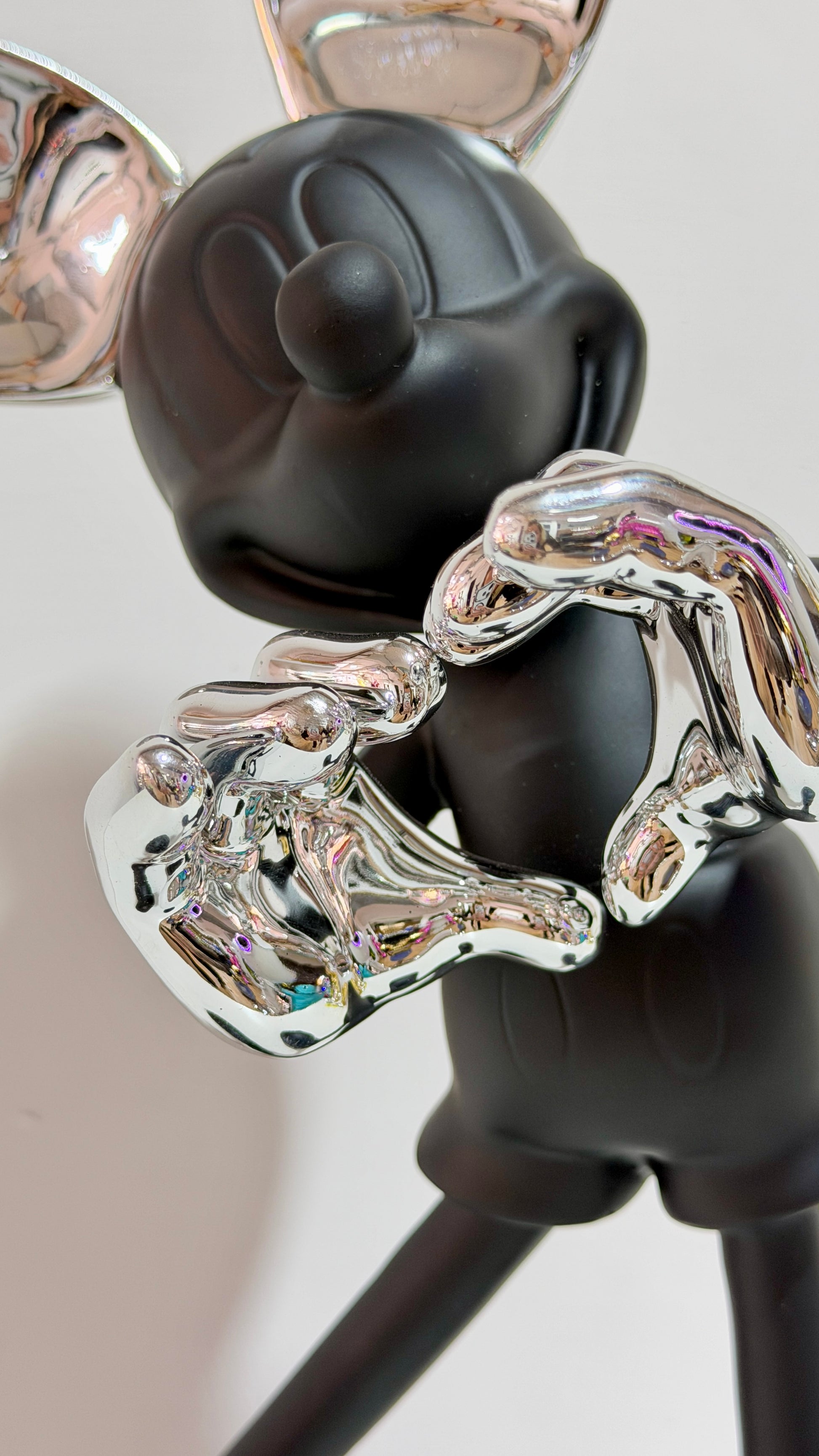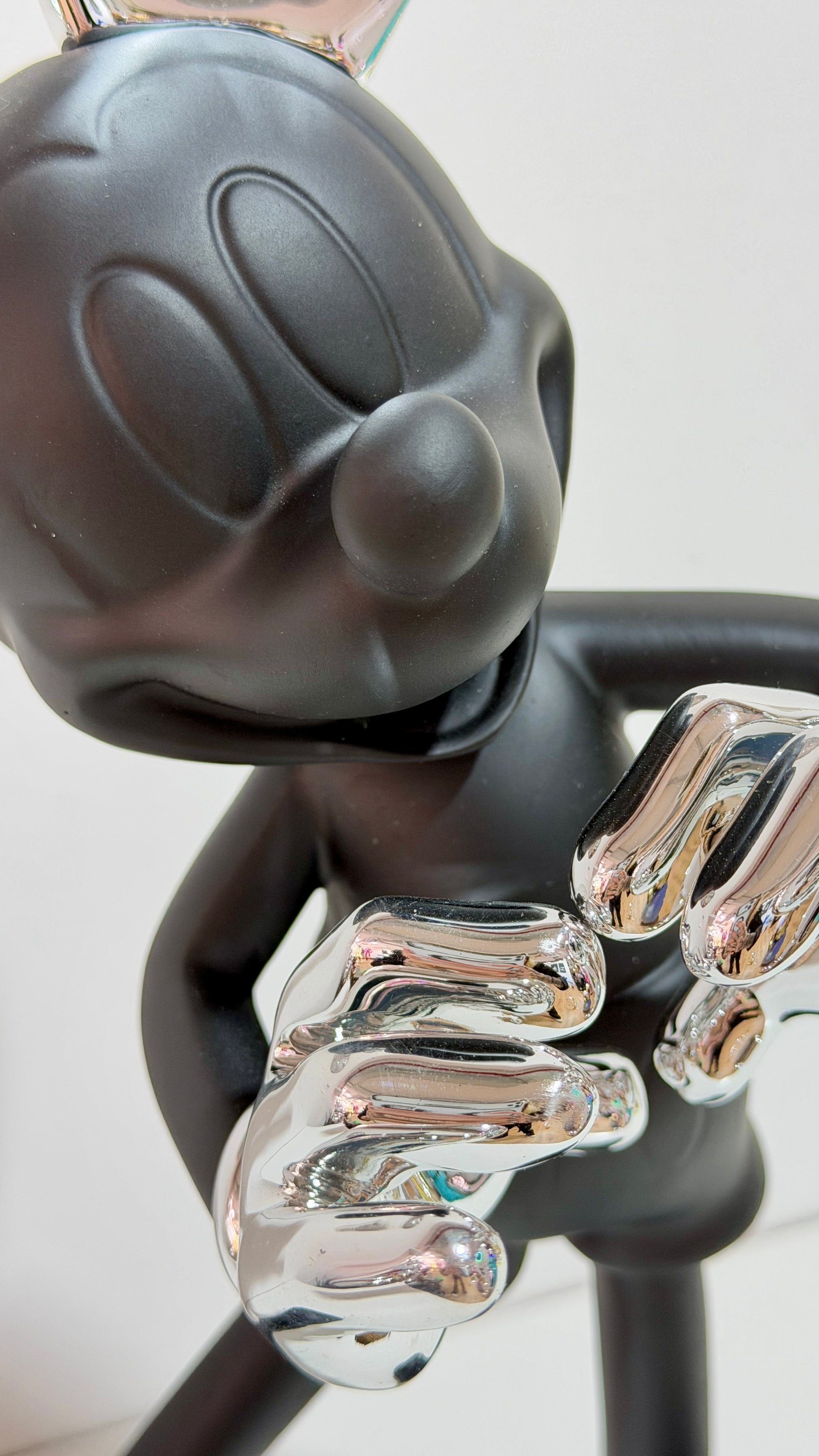 La finitura nera opaca soft-touch contrasta con i dettagli cromati dorati delle mani e delle orecchie, creando un effetto di luce e movimento unico.