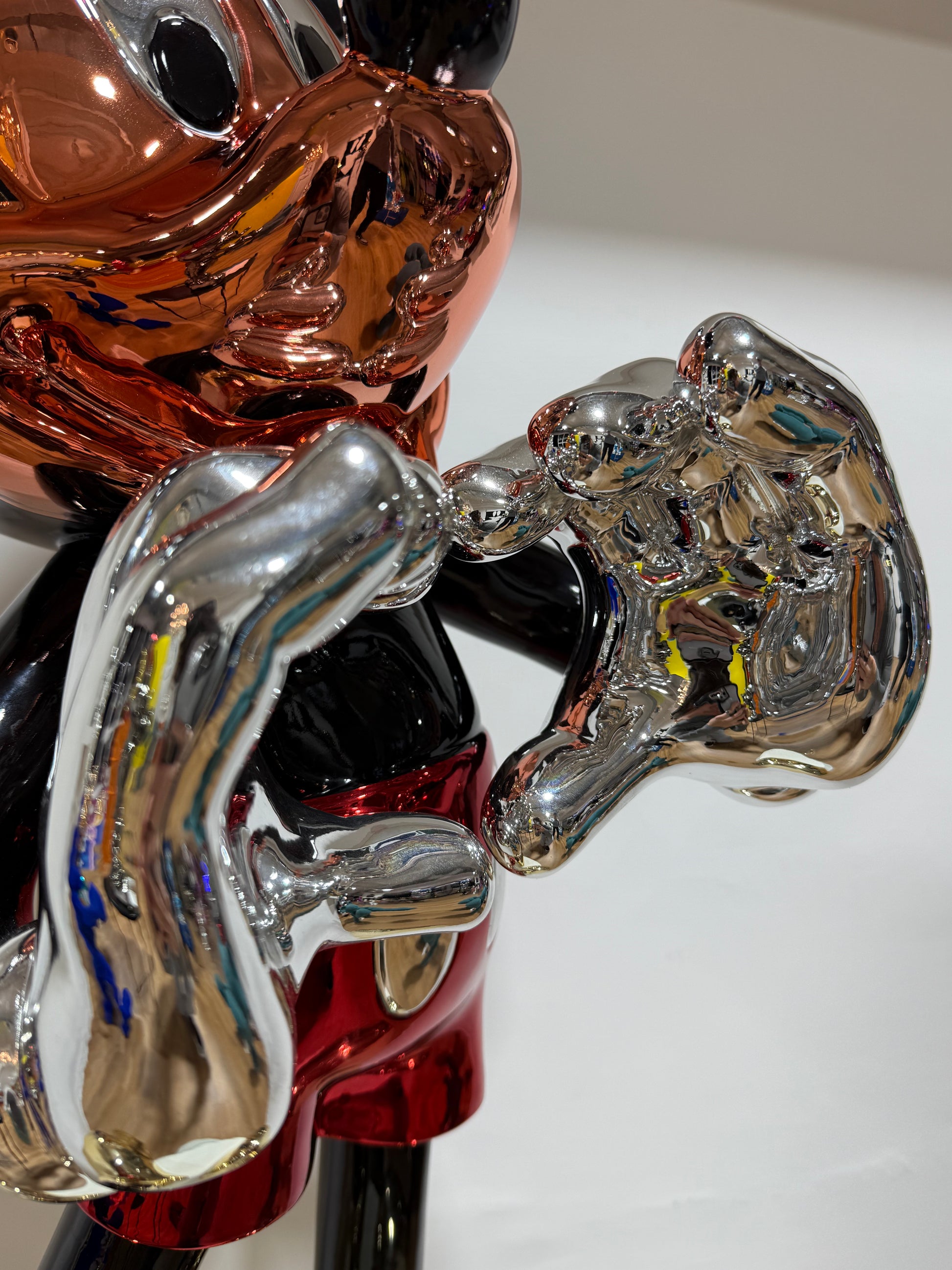 QUESTA SCULTURA ISPIRATA A UN NOTO PERSONAGGIO DEI CARTONI ANIMATI, HA UN ASPETTO METALLICO E RIFLETTENTE CON UNA COMBINAZIONE DI COLORI MOLTO PARTICOLARE: IL VISO È DI UN COLORE RAME LUCIDO, LE MANI ARGENTATE, I PANTALONCINI ROSSI METALLIZZATI, RENDONO L'EFFETTO COMPLESSIVO MODERNO E LUSSUOSO.PERFETTA PER COLLEZIONISTI E AMANTI DELL'ARTE POP CONTEMPORANEA, È UN SIMBOLO DI STILE, CREATIVITÀ E CULTURA POP, PRONTO A DIVENTARE IL PUNTO FOCALE DI QUALSIASI AMBIENTE.
