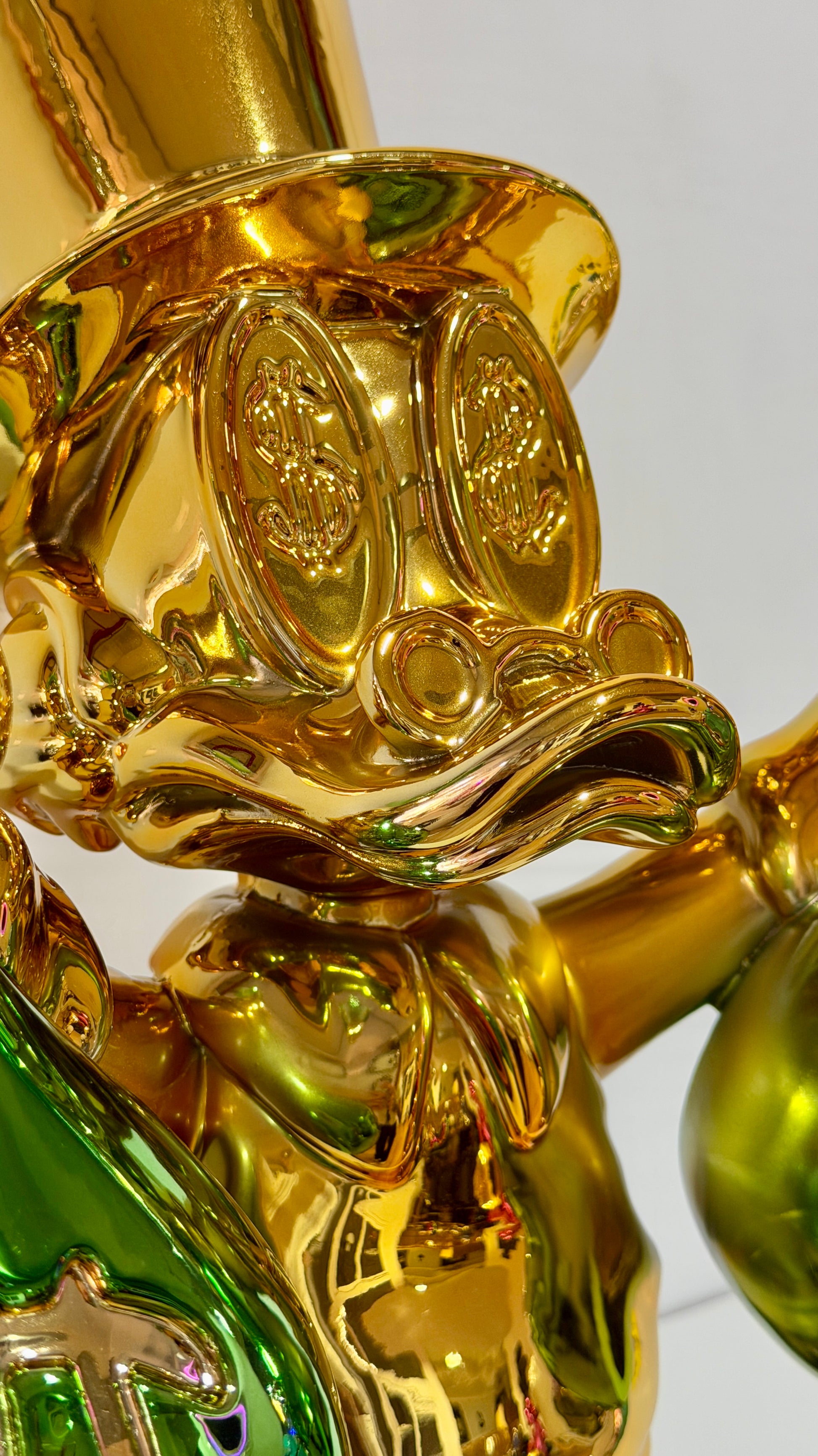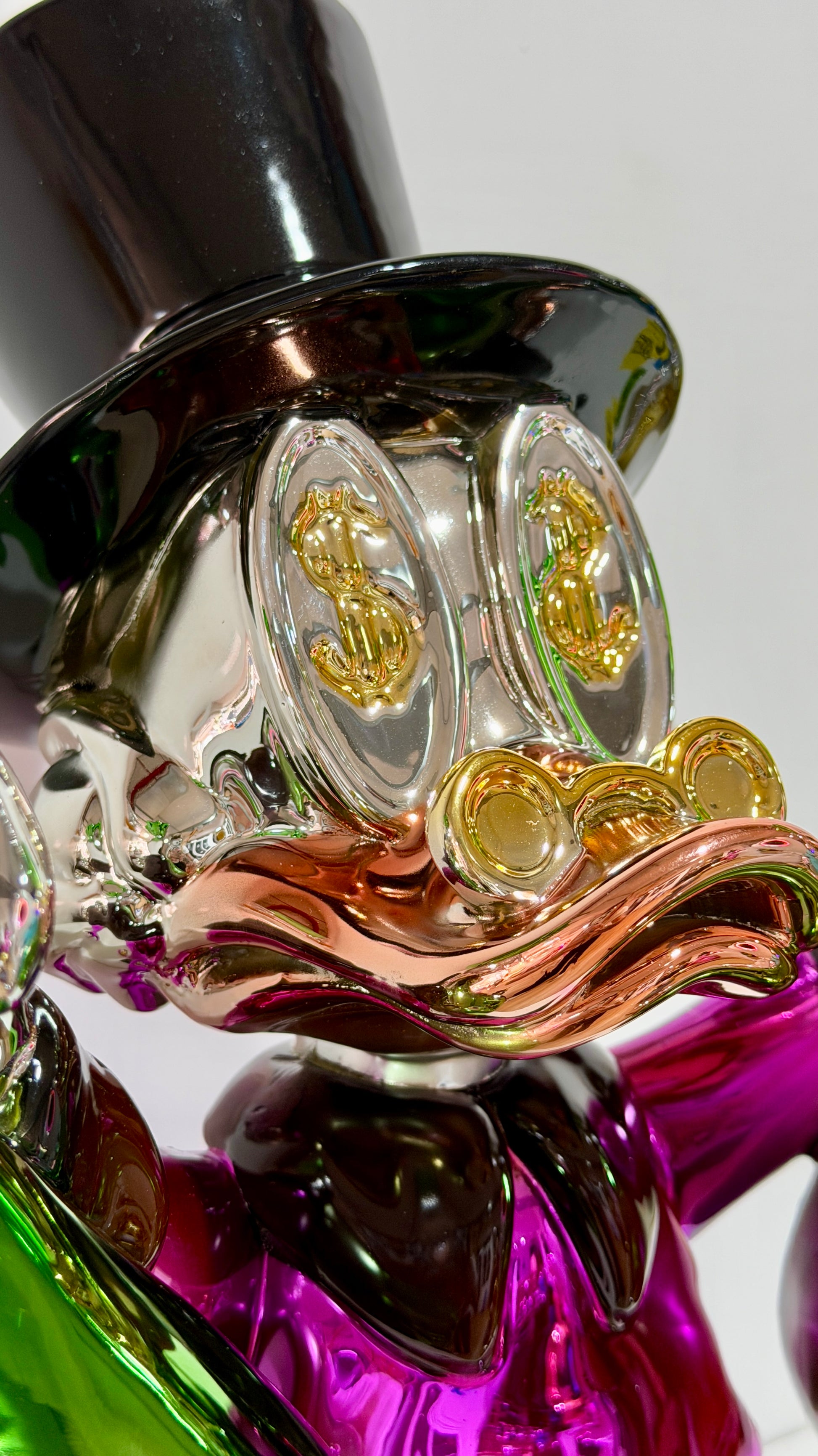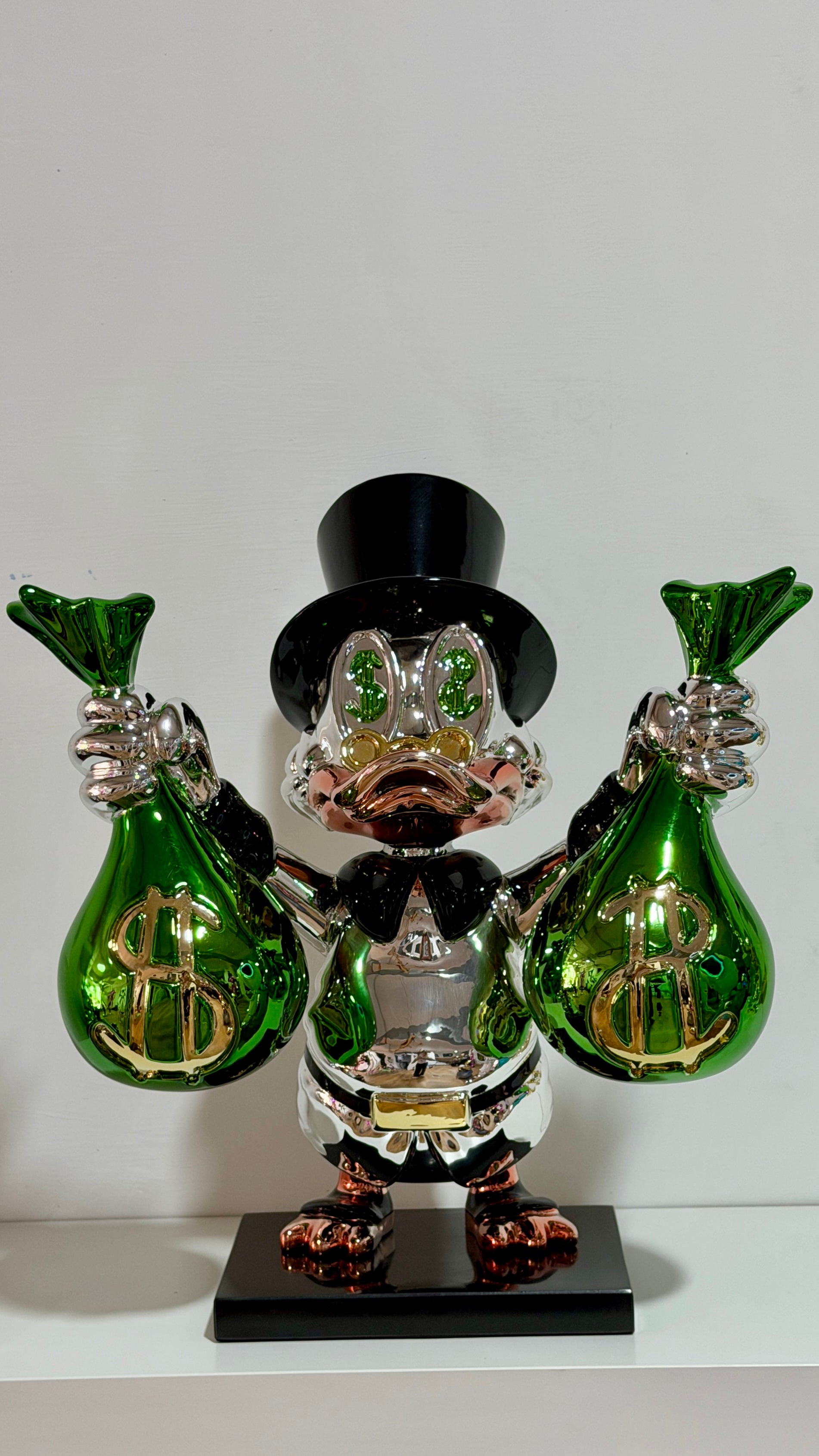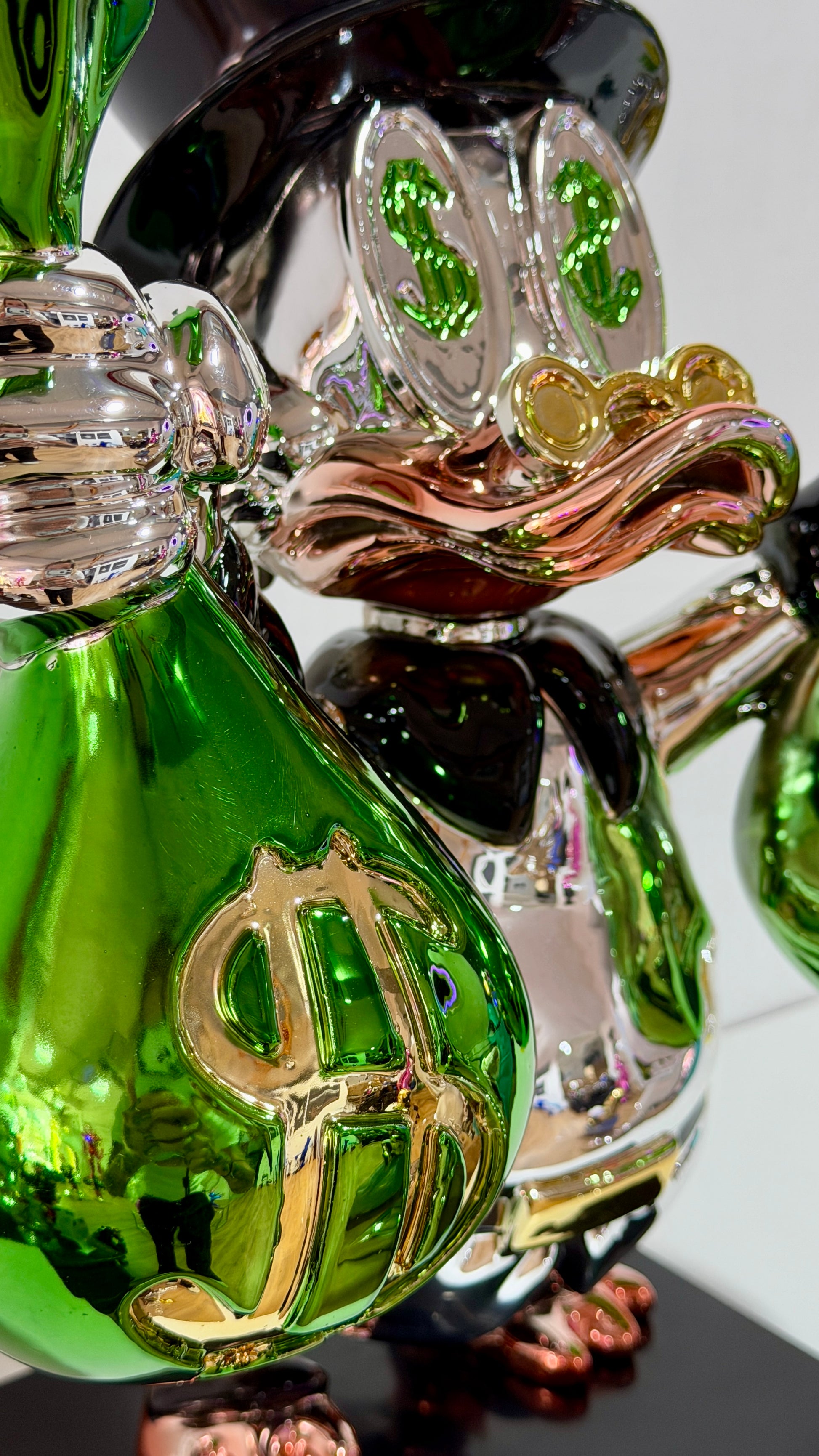 Scultura in resina cromata, raffigurante un papero antropomorfo in stile cartoon, vestito con cilindro nero e abito viola lucido. Tiene in mano due sacchi verdi con simboli del dollaro dorati in rilievo, mentre gli occhi riflettono lo stesso simbolo. La finitura specchiata e i colori metallici rendono il pezzo brillante, ironico e decisamente pop. È un chiaro omaggio alla cultura del denaro e al lusso sfacciato.