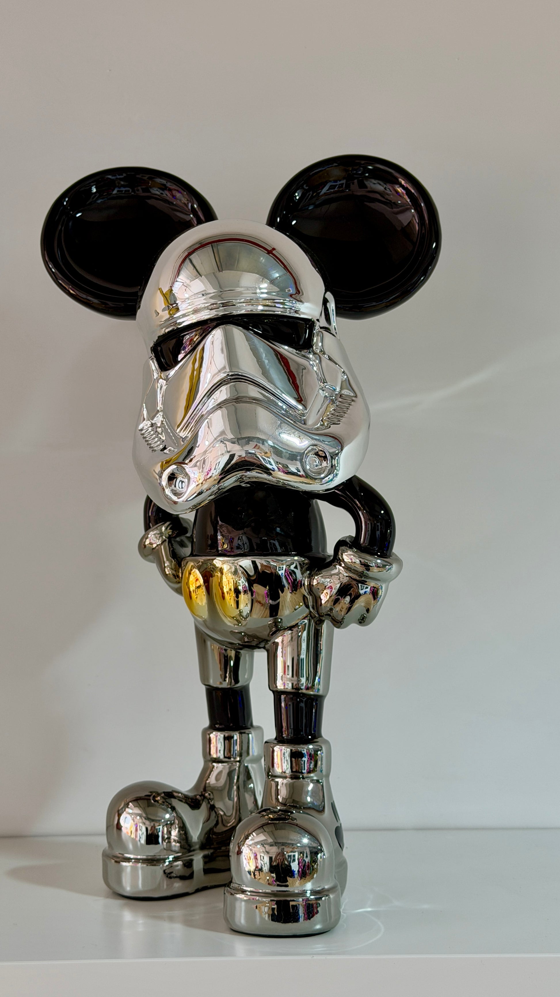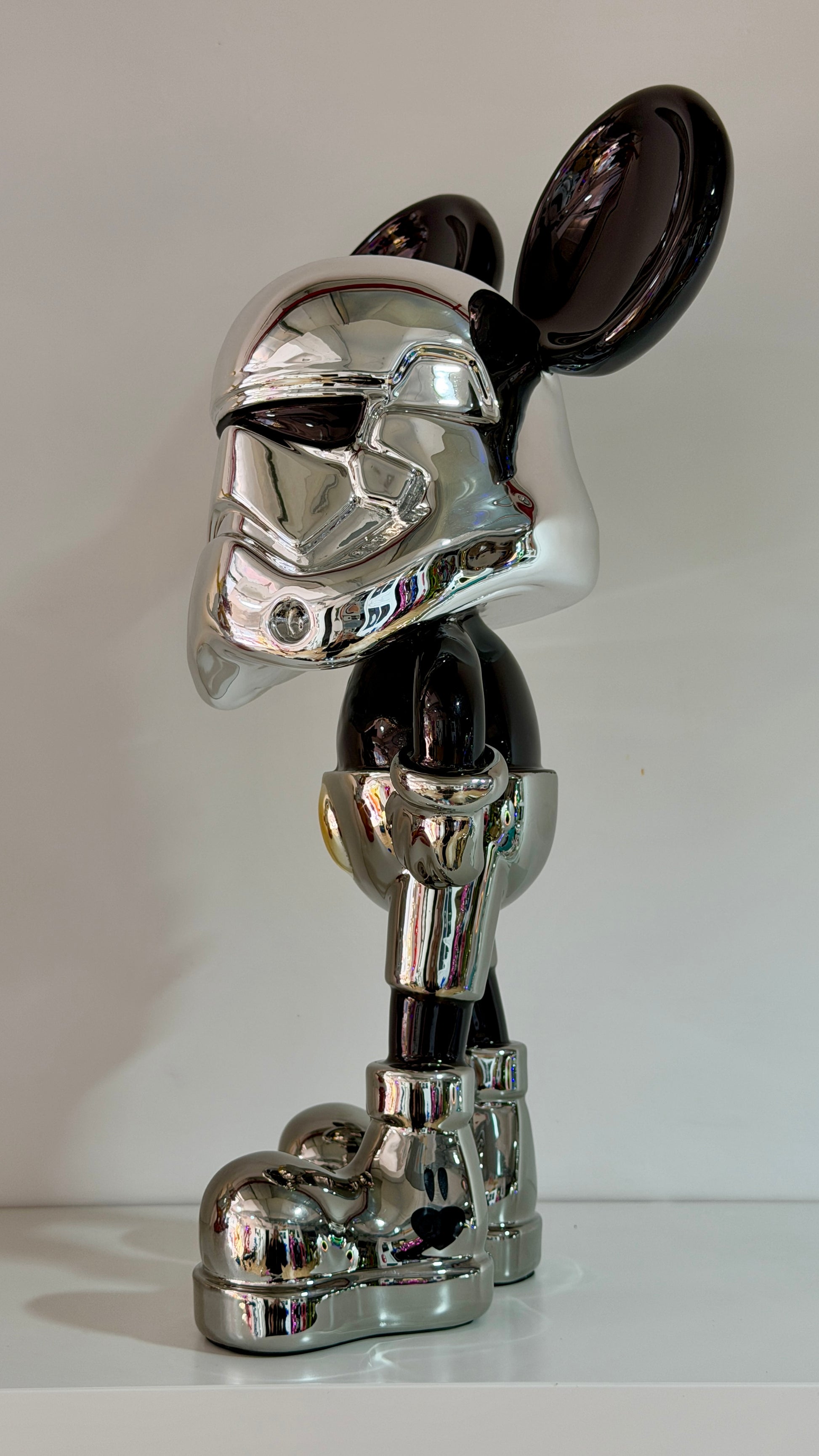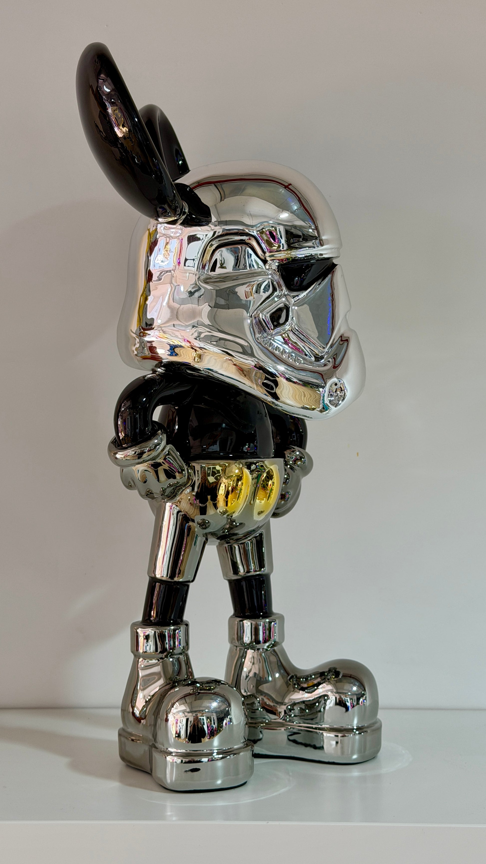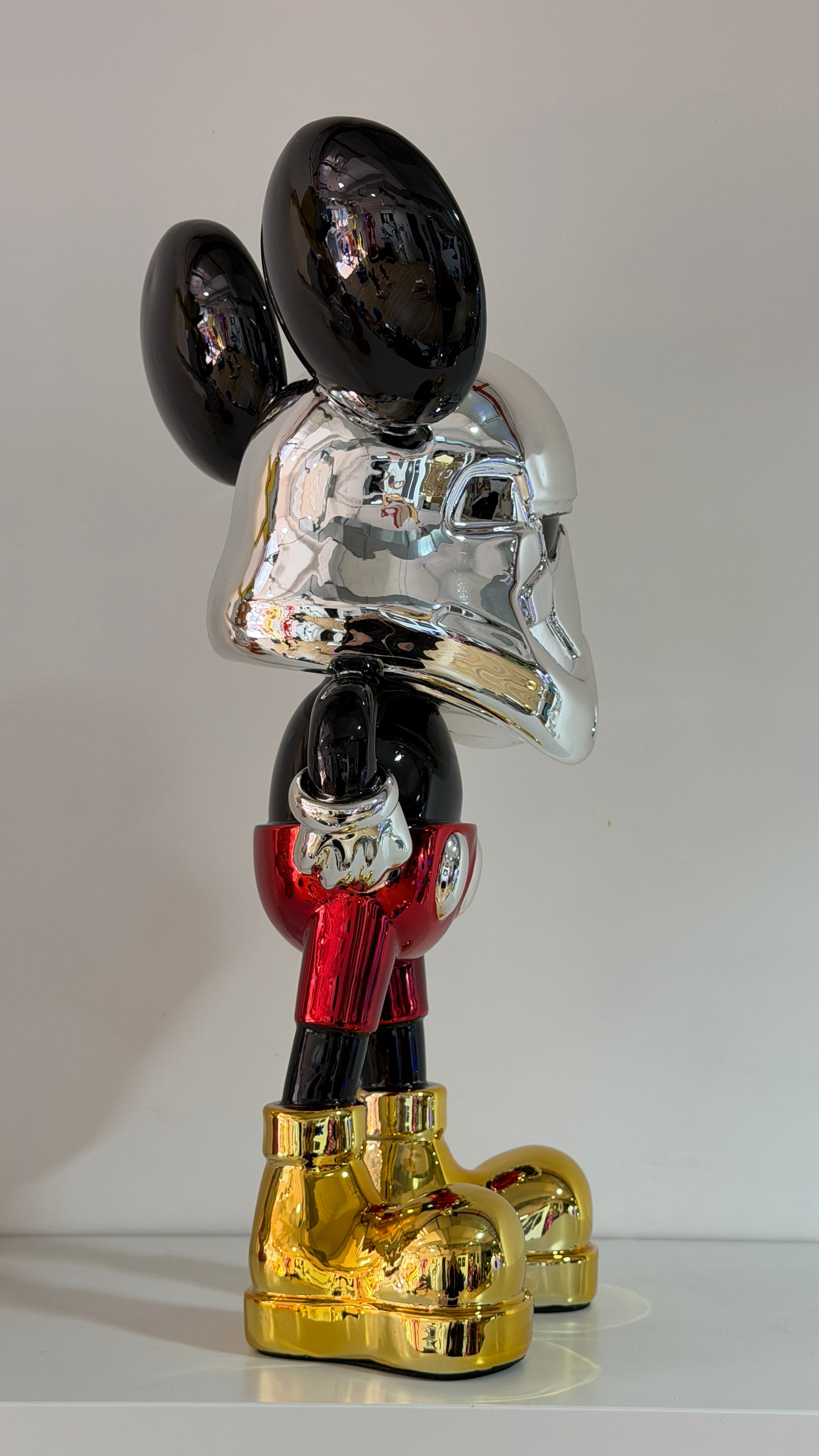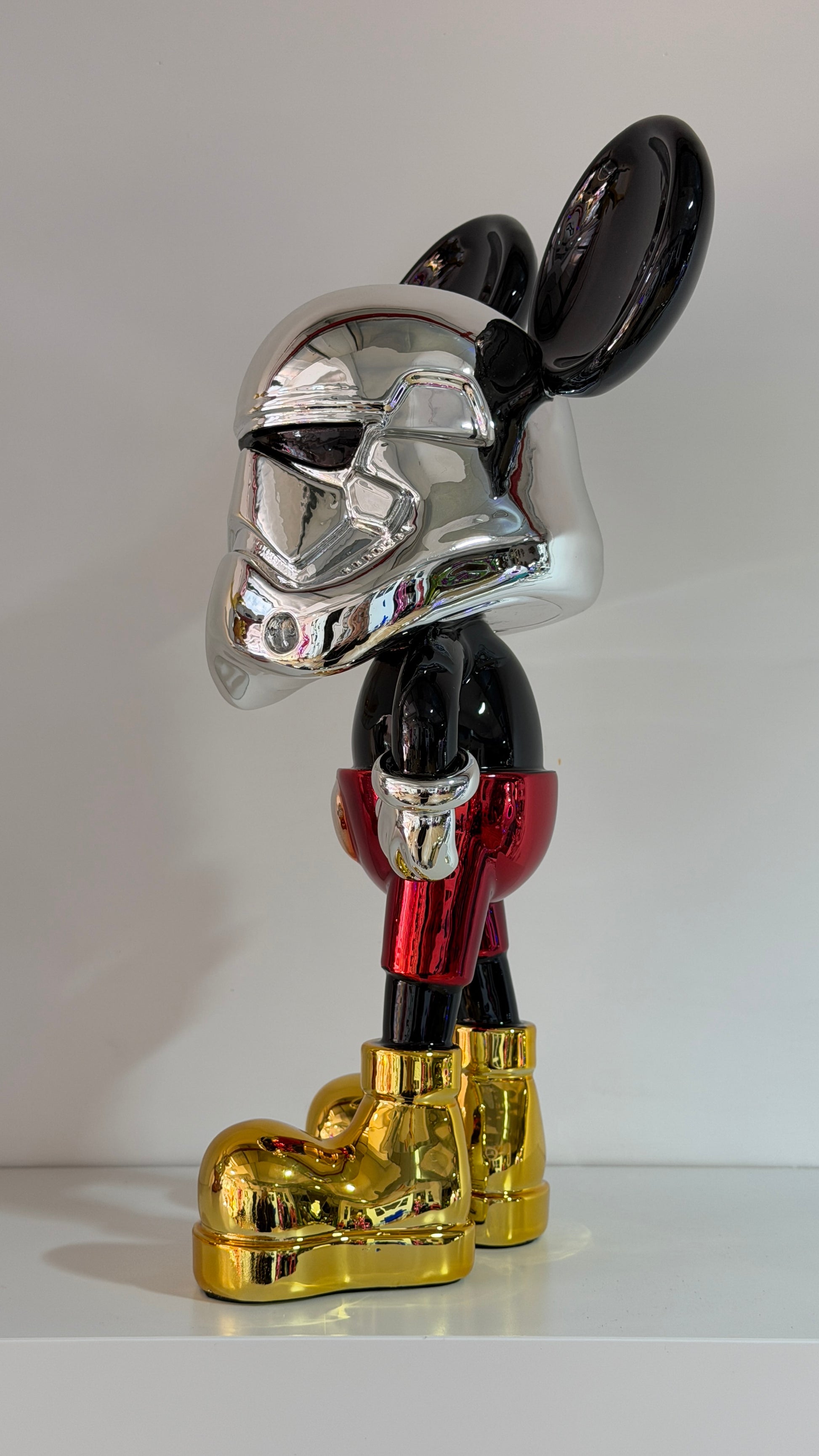 È una scultura lucida e riflettente che unisce due icone pop: un personaggio con orecchie tonde da topo e un elmo argentato da soldato futuristico. Indossa pantaloncini rossi metallizzati con bottoni dorati e grandi stivali d’oro lucente. Le superfici specchianti e i colori vivaci creano un effetto moderno e ironico.