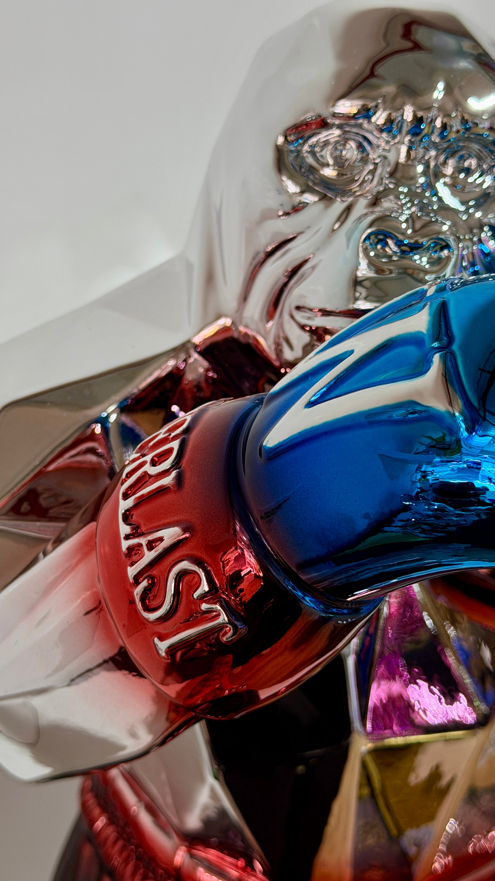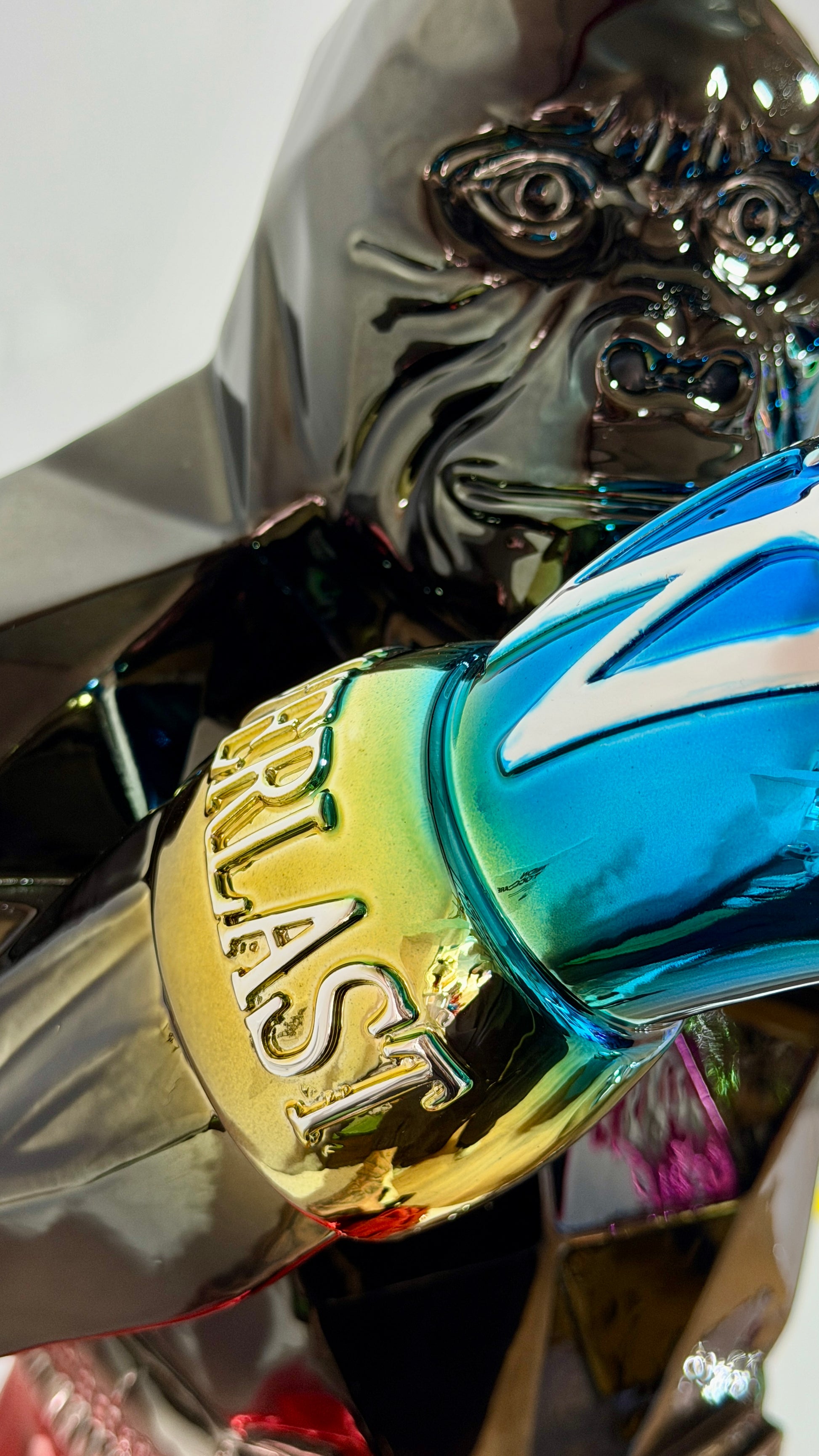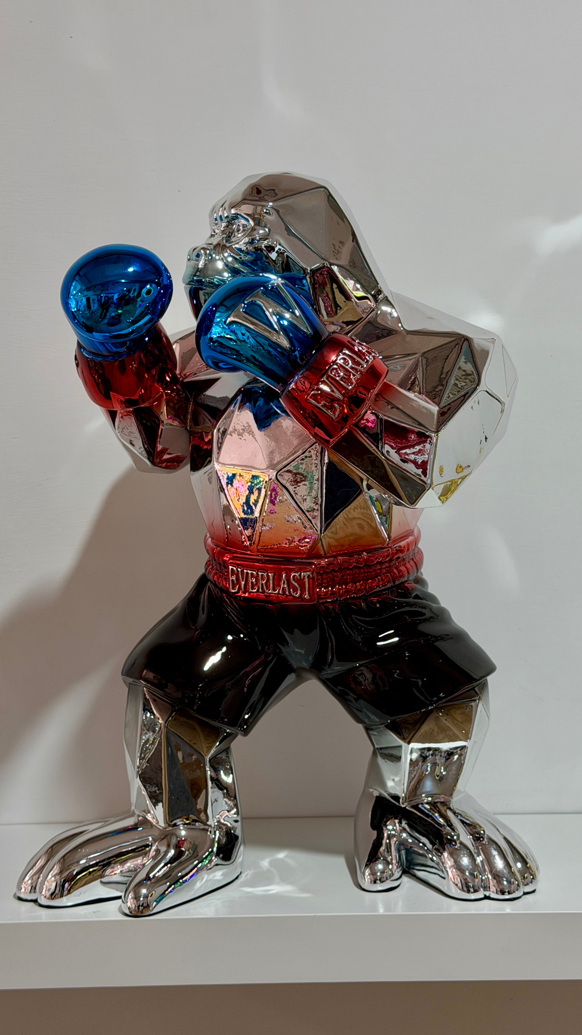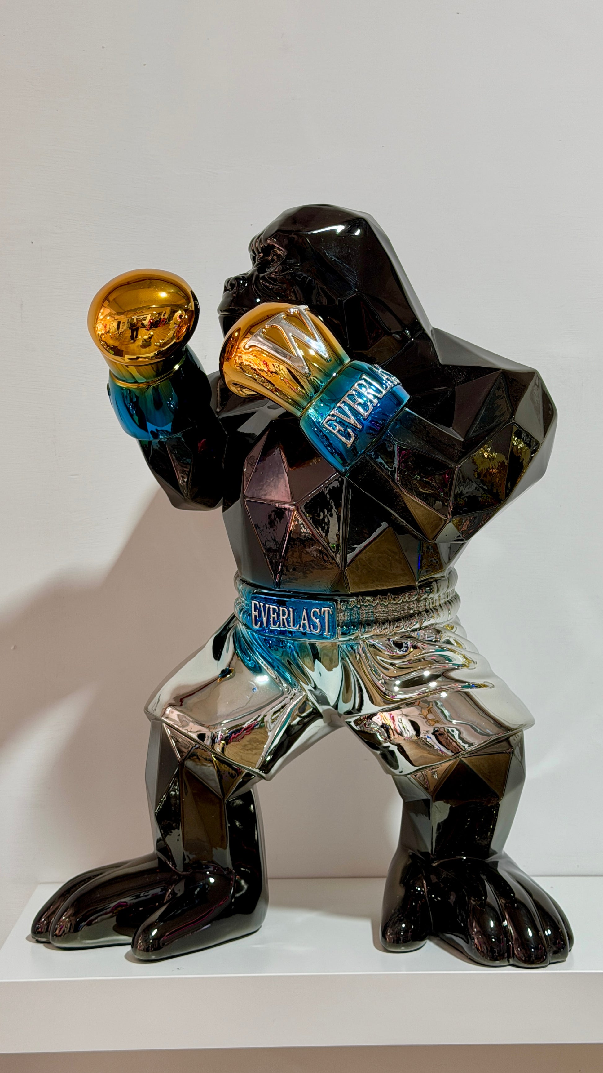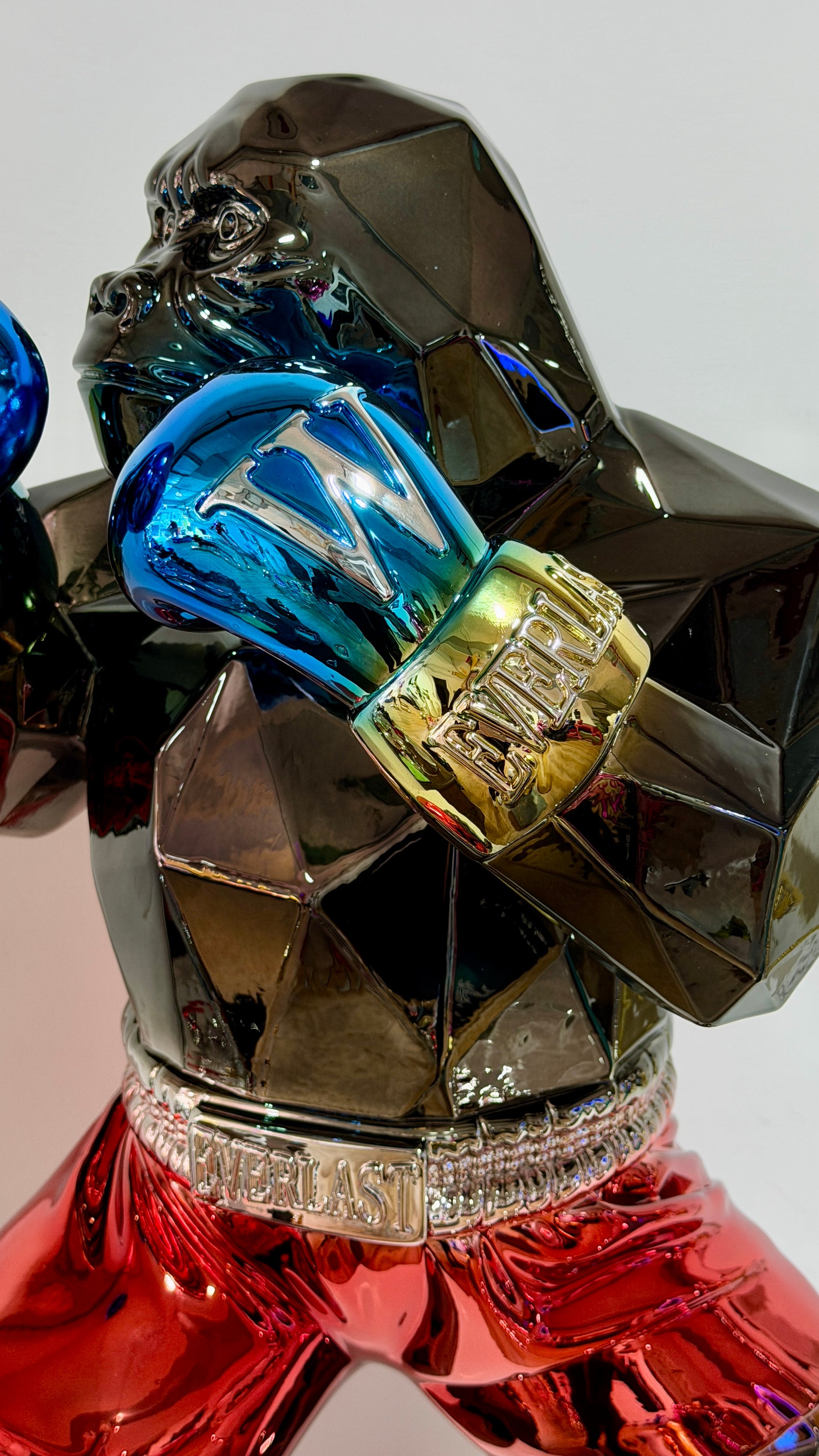È una scultura lucida e sfaccettata che rappresenta un gorilla in posa da pugile. Ha il corpo nero metallizzato, indossa pantaloncini rossi brillanti e guantoni blu iridescenti con dettagli dorati. L’opera ha uno stile moderno, con superfici riflettenti che le conferiscono un aspetto potente e dinamico.