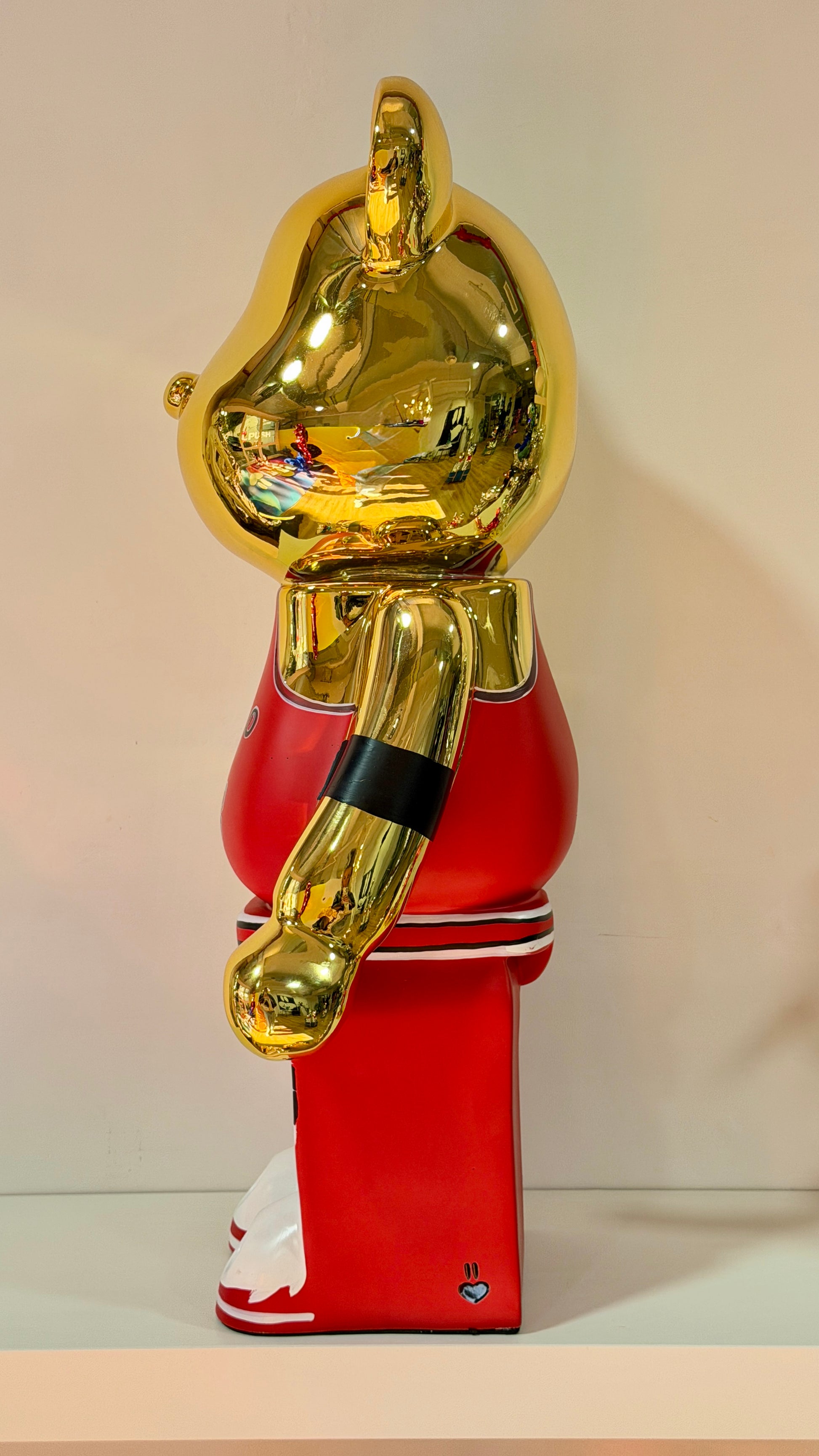 La finitura dorata effetto specchio e la divisa rossa “Chicago 23” rendono questa scultura un pezzo d’arte vivace, audace e immediatamente riconoscibile.